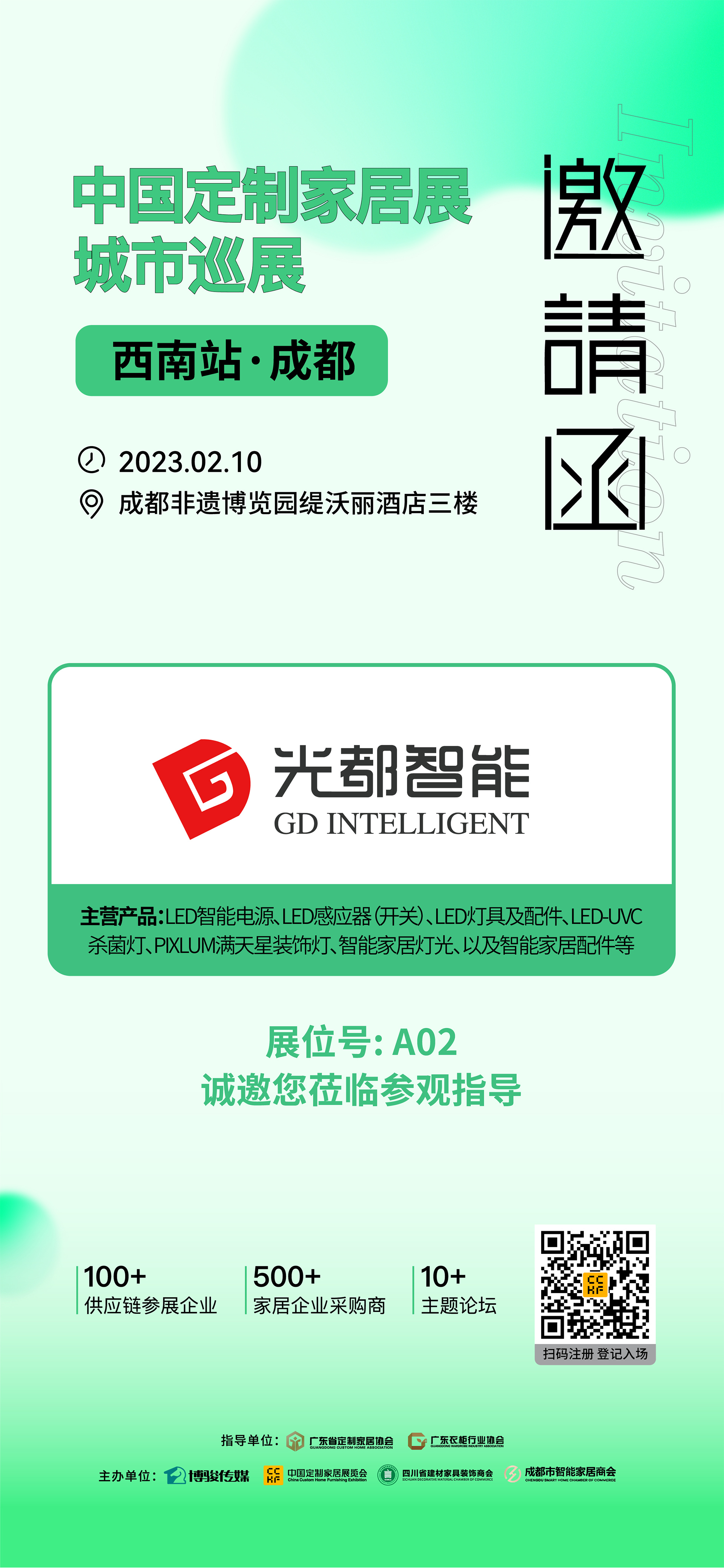 中國定制家居展·城市巡展-成都站暨2022-2023年度中國定制家居產(chǎn)業(yè)鏈成都峰會于2023年2月10-11日在成都非遺博覽園緹沃麗酒店盛大舉行,光都展位編號A02,新品綻放,到訪有禮,誠邀您蒞臨參觀指導(dǎo)!參觀登記:https://xz.chfcdu.com/?fr=xzzs