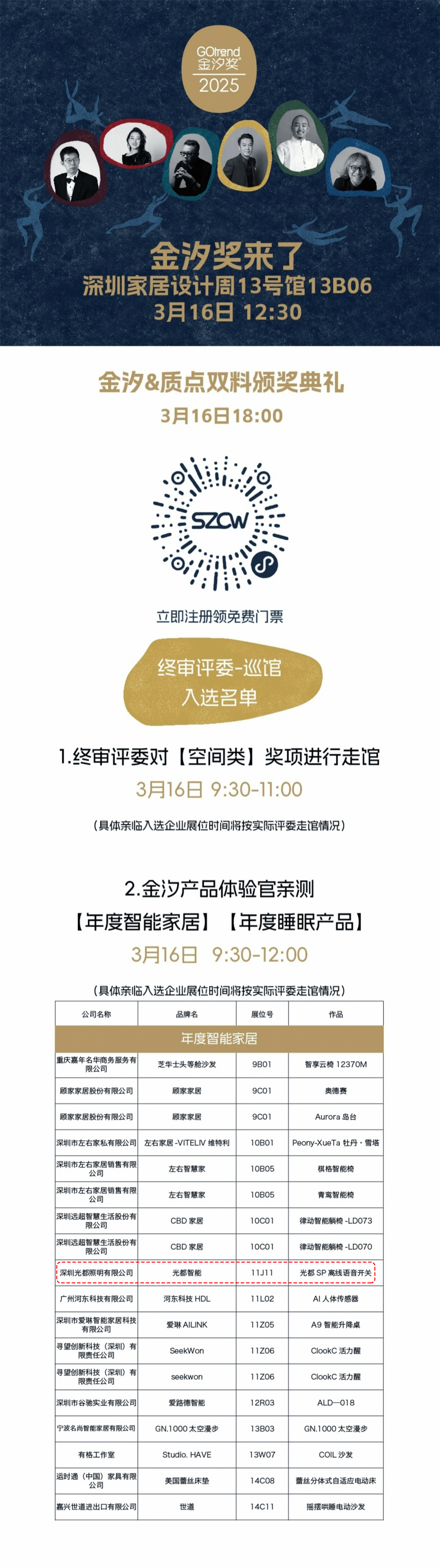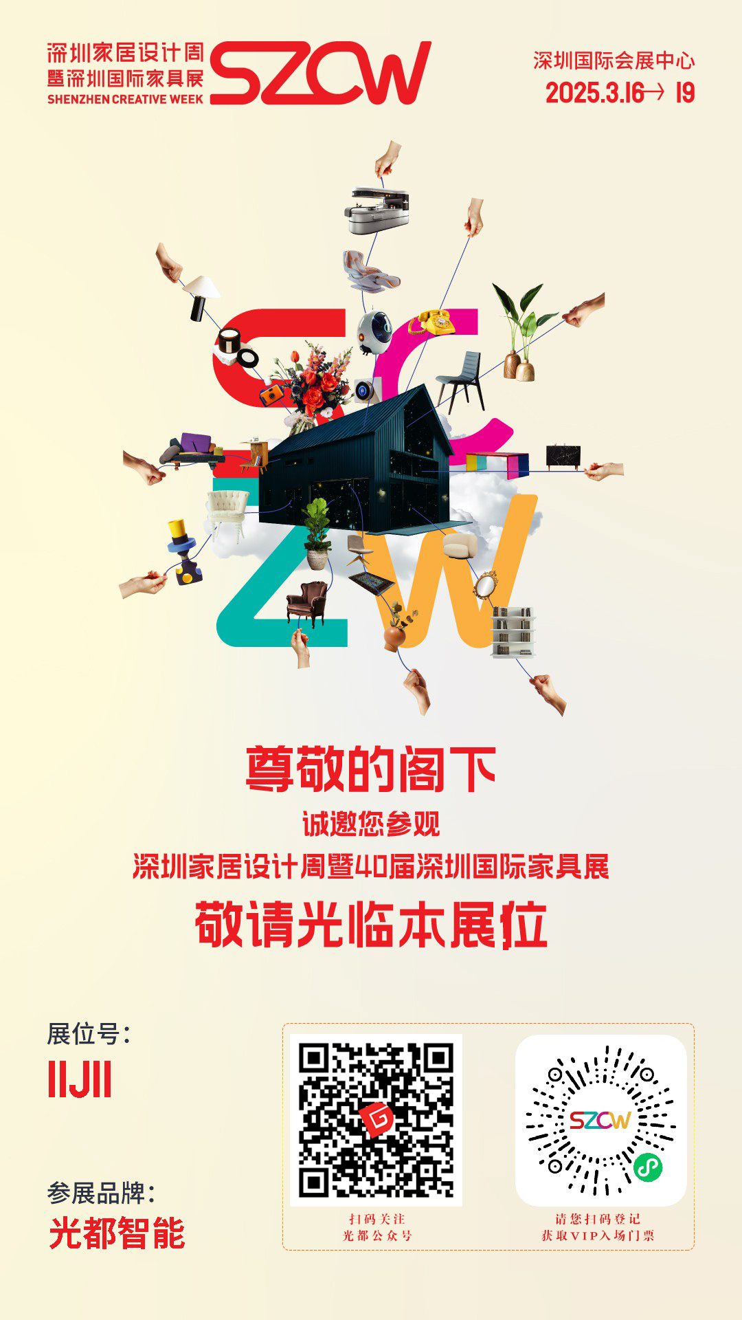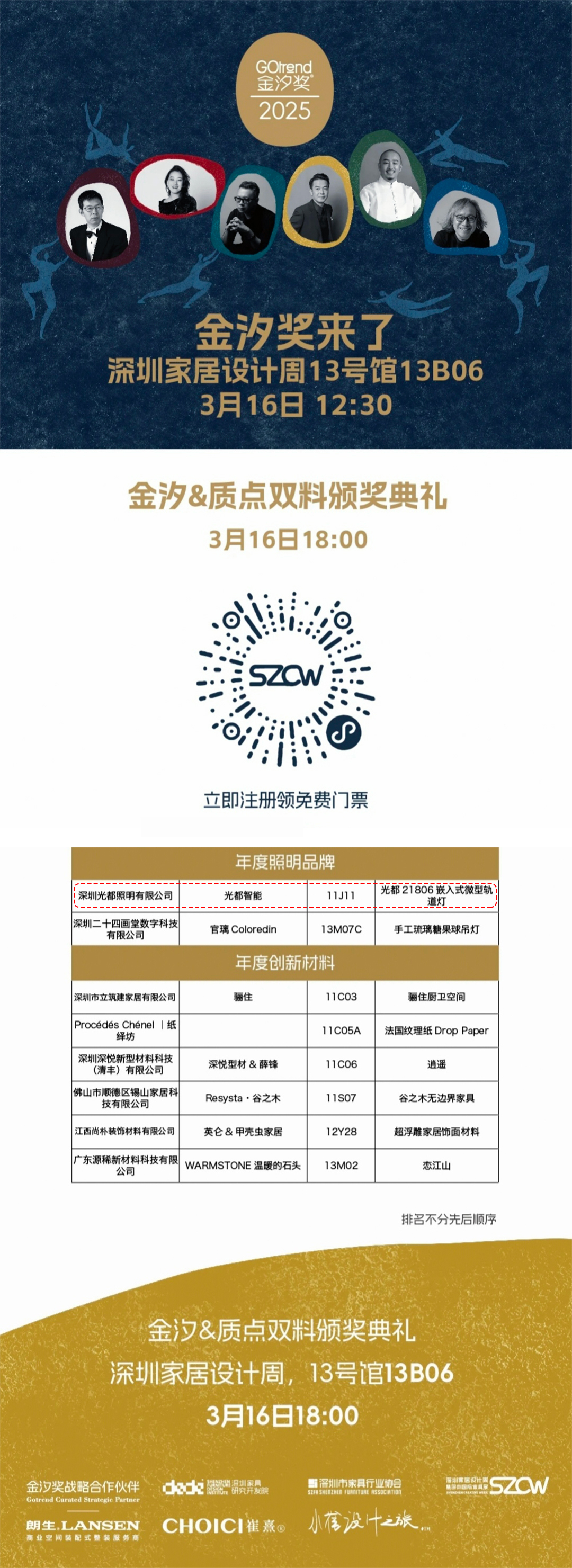 恭喜光都21806嵌入式微型軌道燈和輕智能SP離線語音開關(guān)斬獲2025深圳家居設(shè)計周暨第40屆深圳國際家具展金汐&質(zhì)點雙料大獎,展位現(xiàn)場有場景體驗和實物演示,3.16-19日歡迎蒞臨11號館11J11光都智能展位交流體驗,光都攜照明、智能、光電多款新品首發(fā)亮相,家居照明出口冠軍企業(yè),定制家居燈光專家期待與您相聚鵬城,不見不散哦