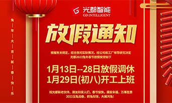 光都2023兔年春节放假通知:2023年1月13-28日放假调休,1月29日(初八)开工。2022感谢相伴,感恩有您!恭祝新老伙伴朋友家人们,春节愉快,阖家幸福,万事胜意!2023玉兔迎春,...