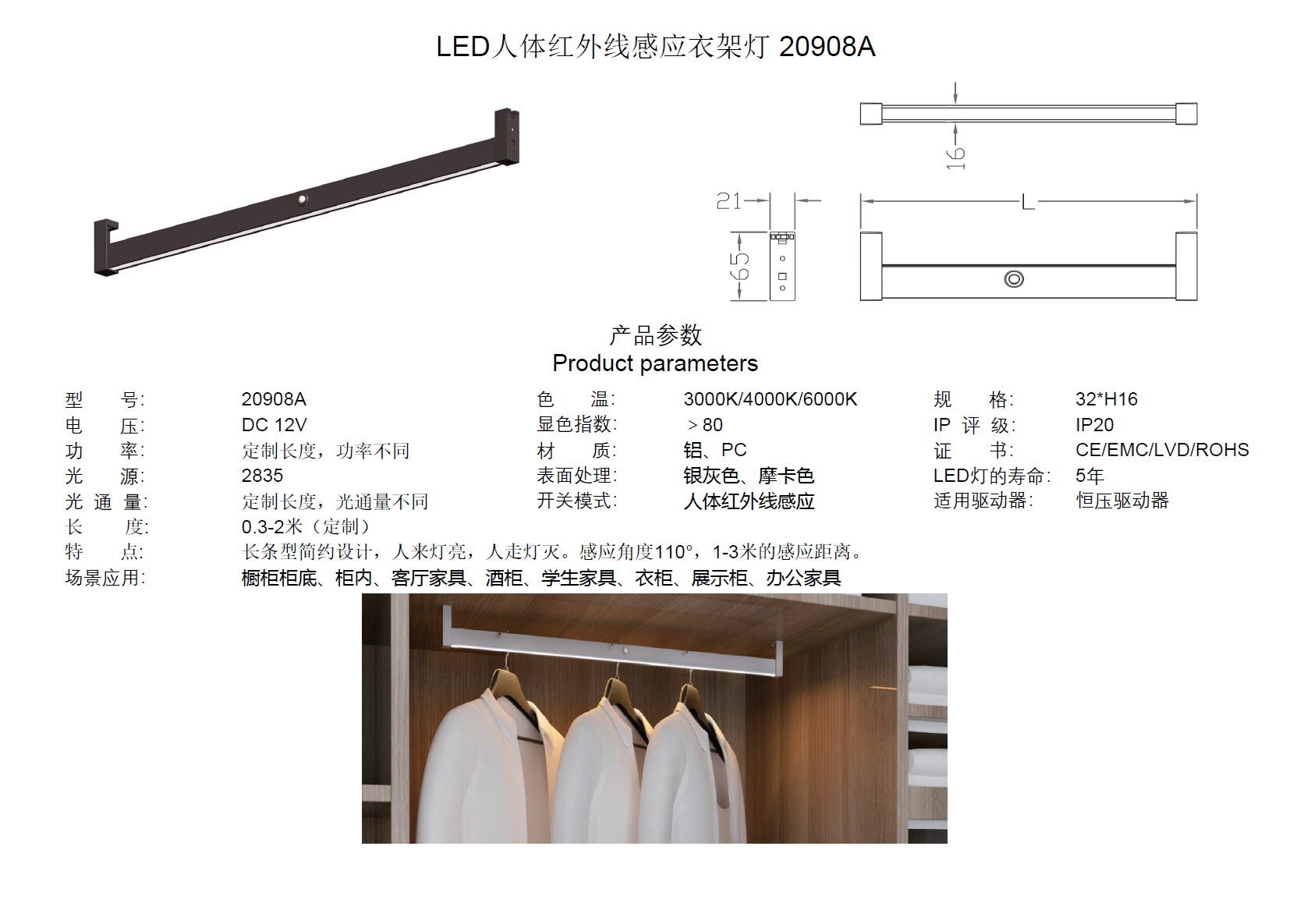 鋰電池LED人體紅外線感應(yīng)衣架燈 20908B