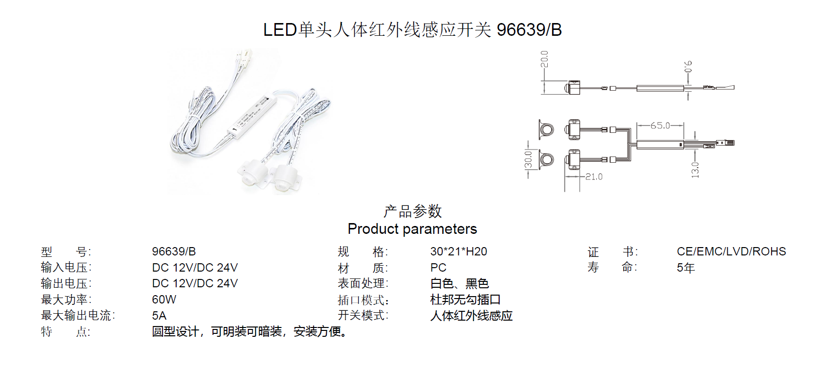 LED單頭人體紅外線(xiàn)感應(yīng)開(kāi)關(guān) 96648P